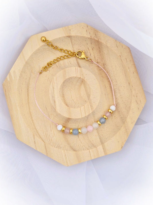 Bransoletka na sznurku z różowym opalem i masą perłową