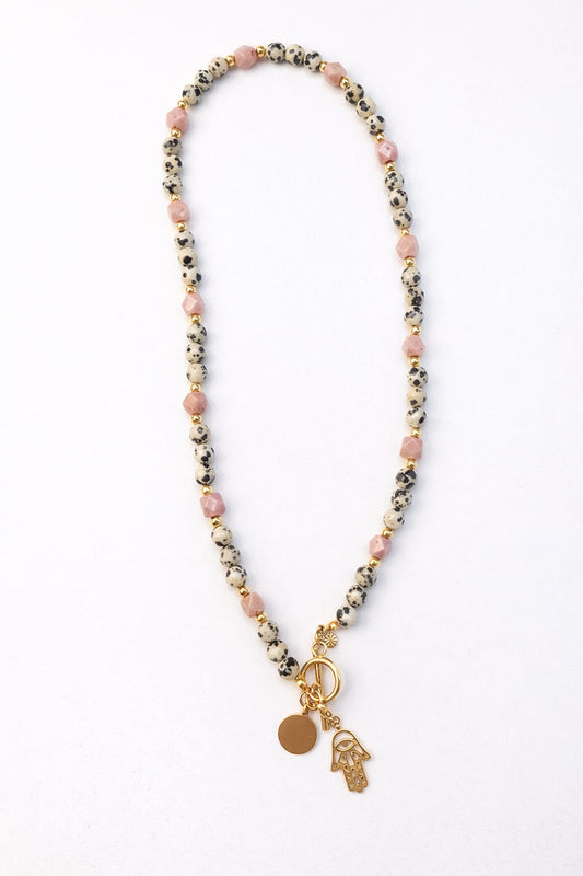 Naszyjnik z jaspisem dalmatyńskim i rodonitem – Ręka Opatrzności, 49 cm