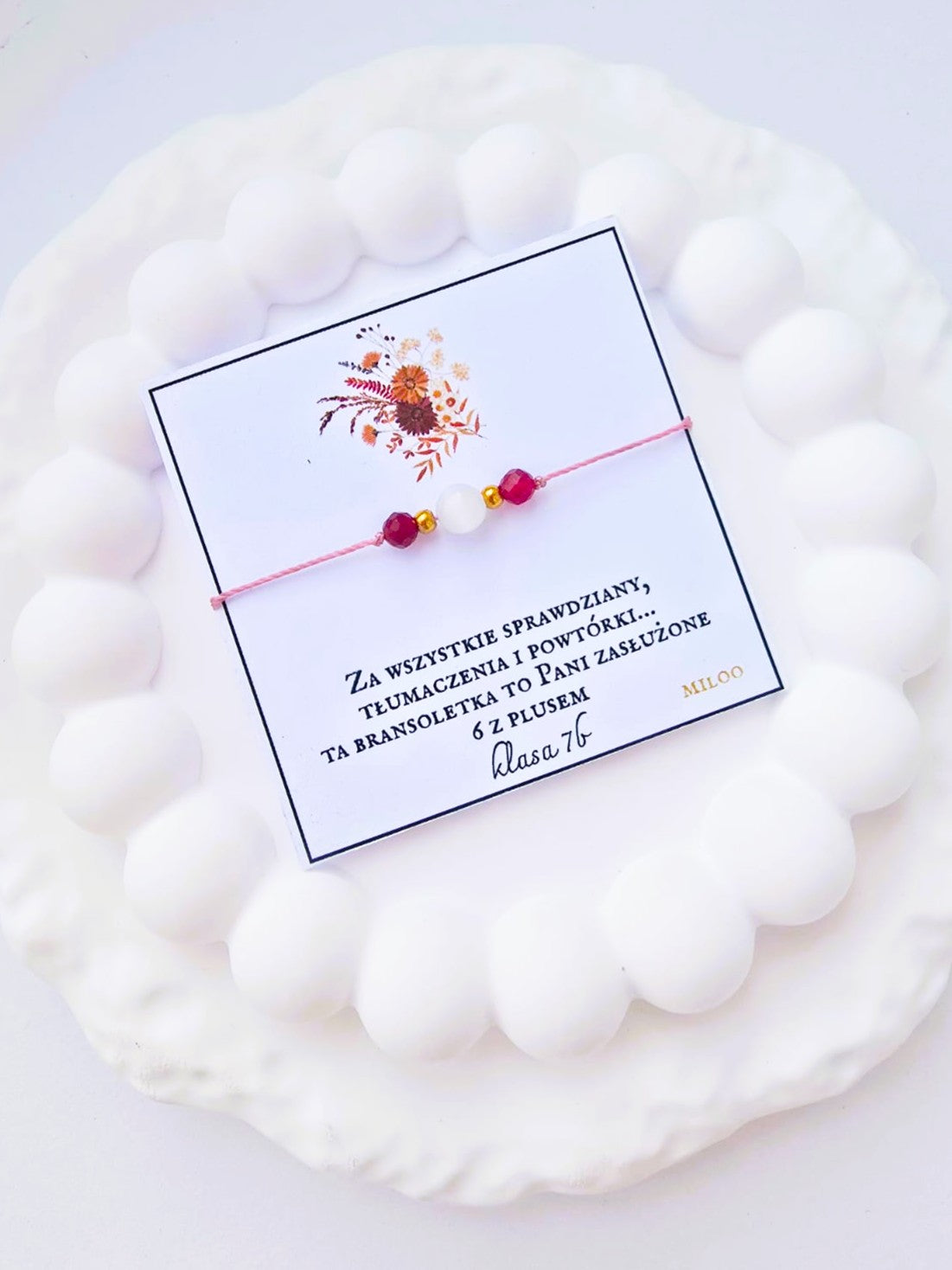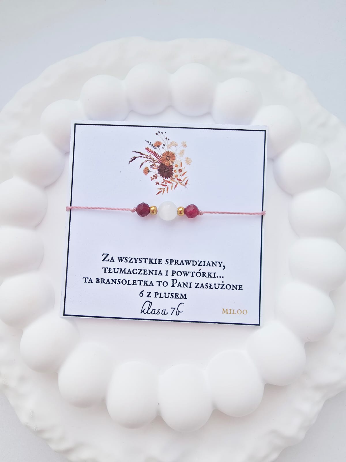 Delikatna bransoletka sznurkowa dla nauczyciela z kamieniem księżycowym i rubinem to wyjątkowy prezent, który łączy subtelność z piękną symboliką.