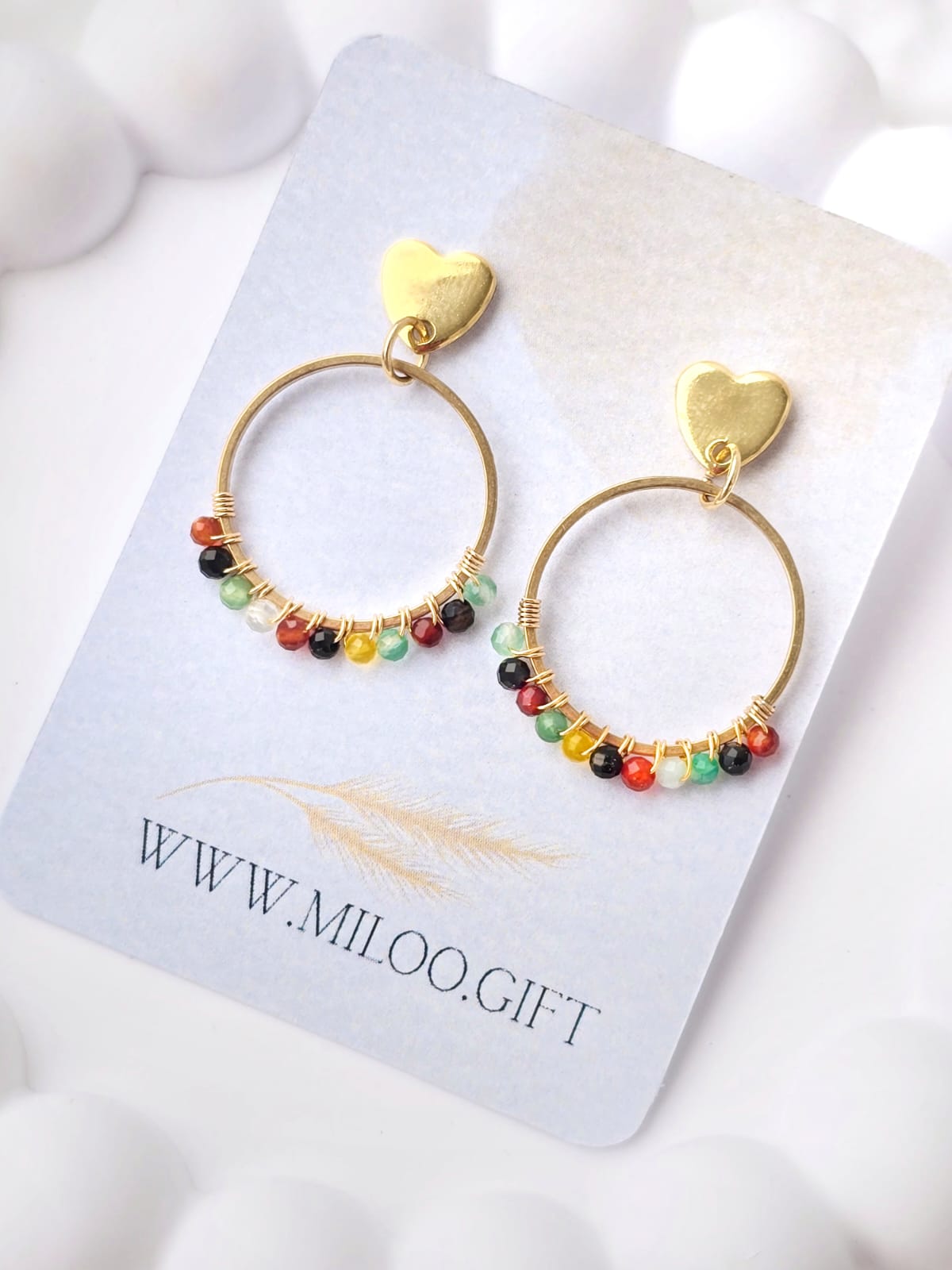Delikatne, a zarazem przyciągające wzrok kolczyki z pozłacanymi kółeczkami z ręcznie oplecionymi naturalnymi kamieniami kolorowego agatu.