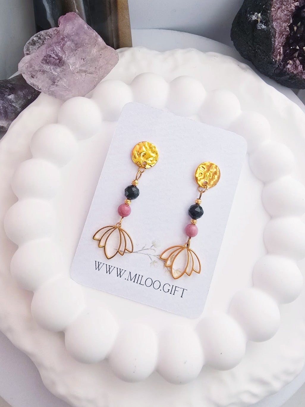 Kolczyki z rodonitem i czarnym turmalinem z zawieszką kwiatu lotosu