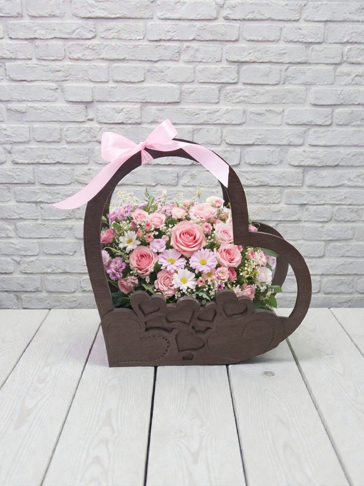 Koszyczek w kształcie serca z płyty HDF wenge – idealny na kwiaty i prezenty