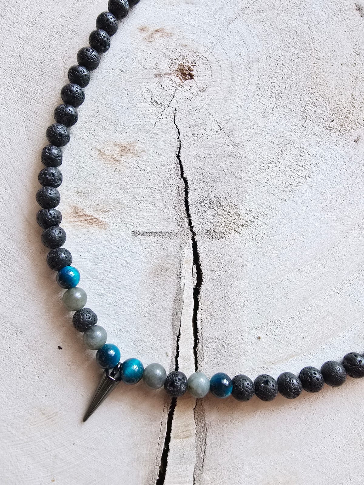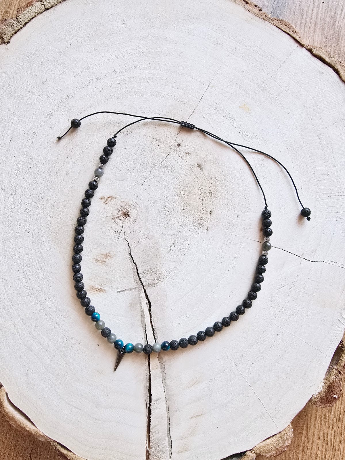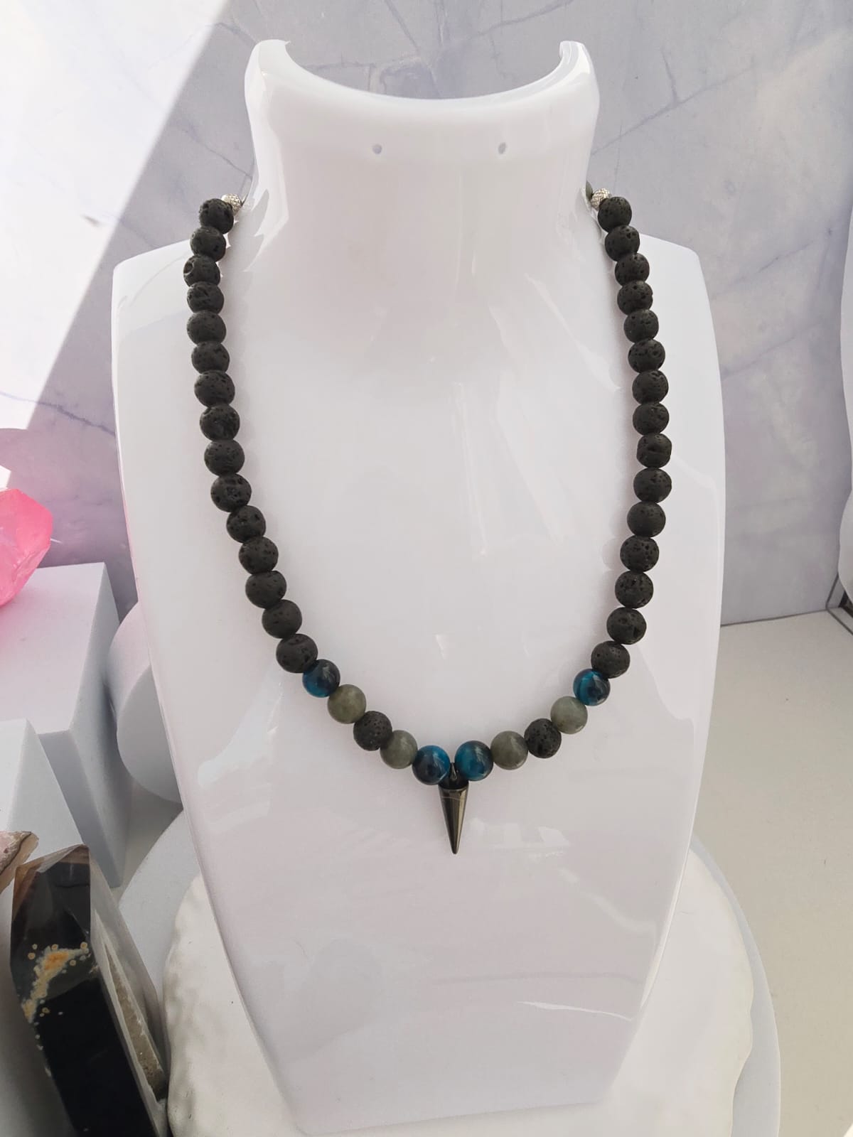 Ten naszyjnik to nie tylko styl – to talizman mocy. Połączenie tygrysiego oka, lawy wulkanicznej i labradorytu działa jak energetyczna zbroja dla mężczyzny, który wie, czego chce.